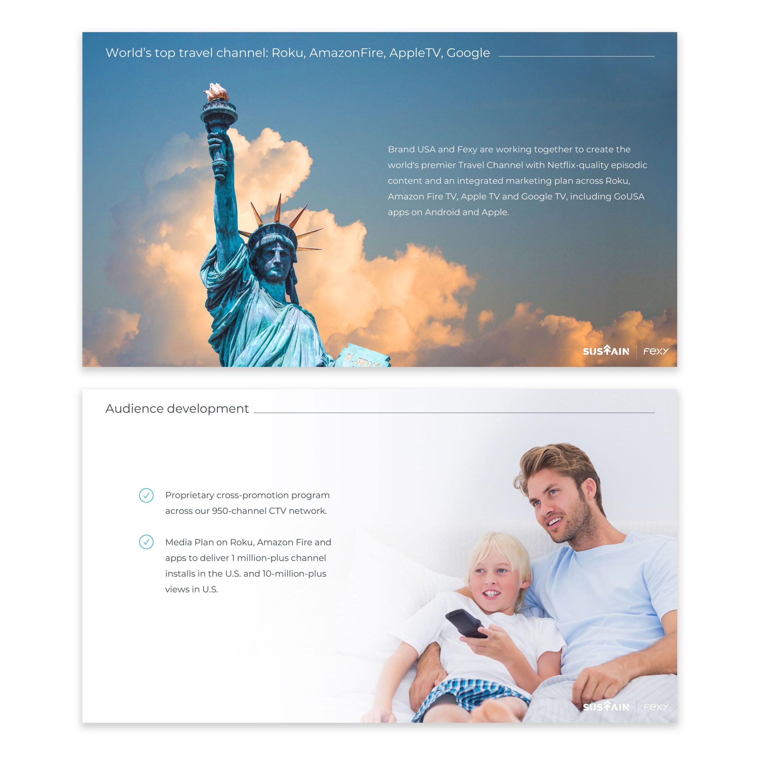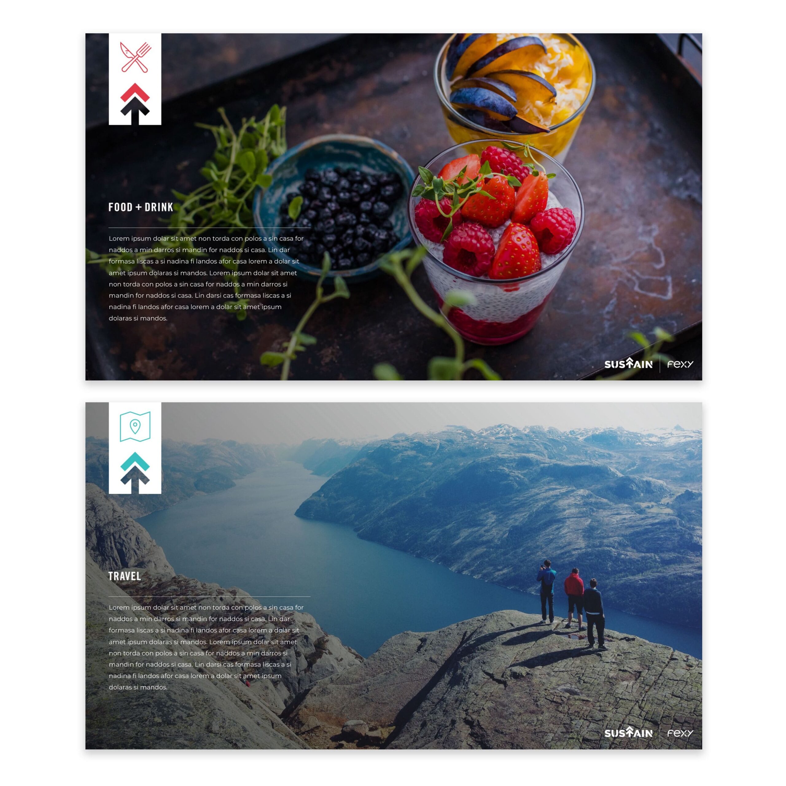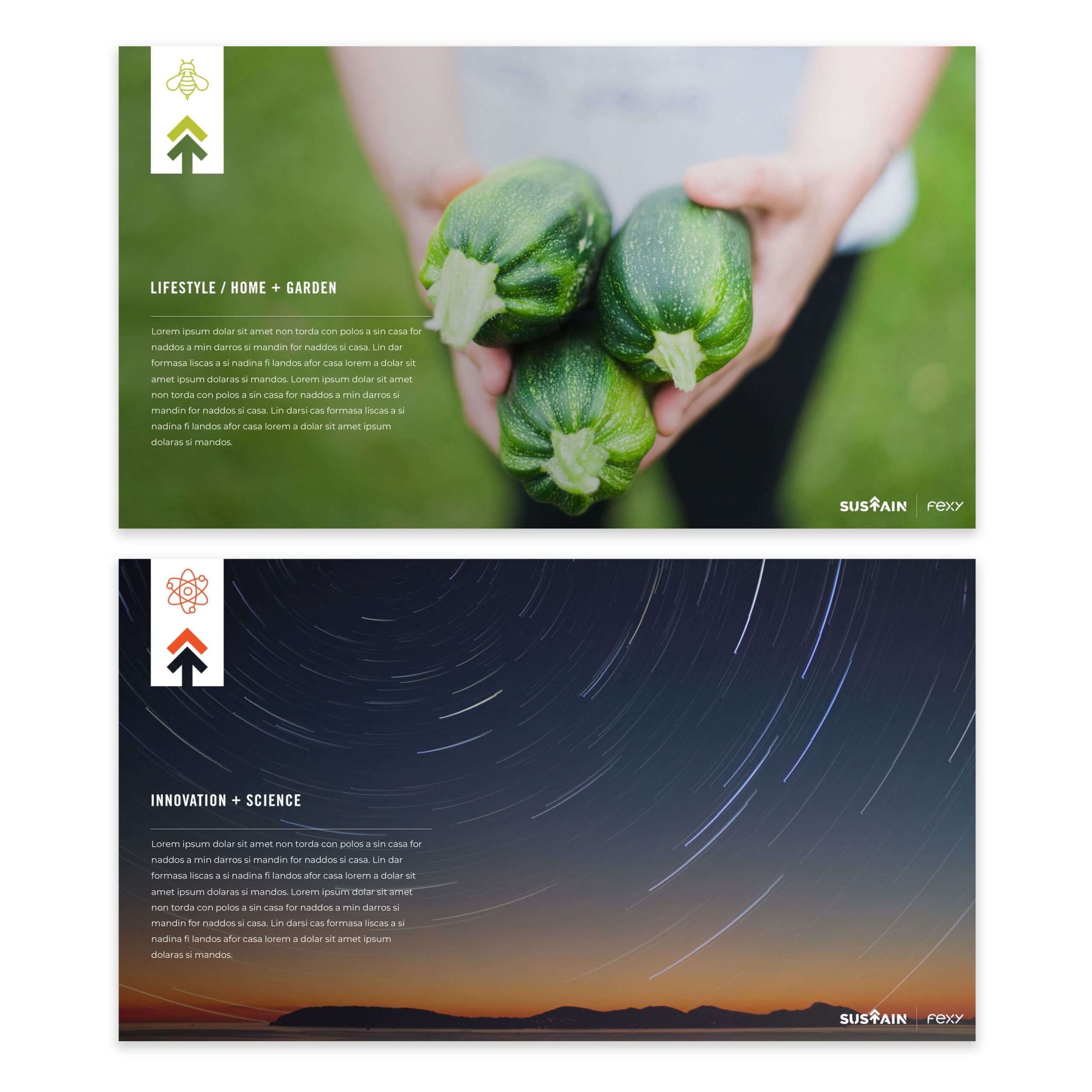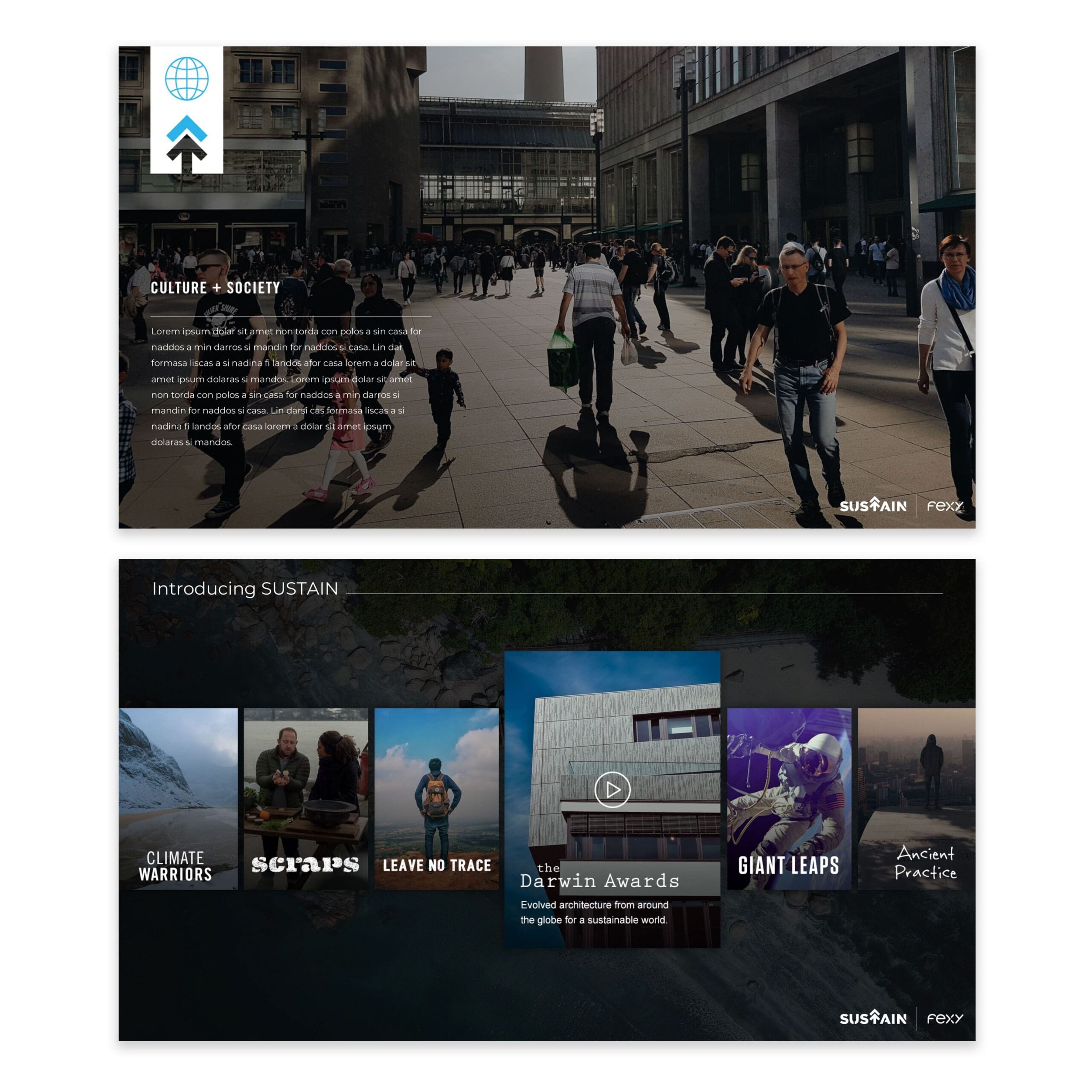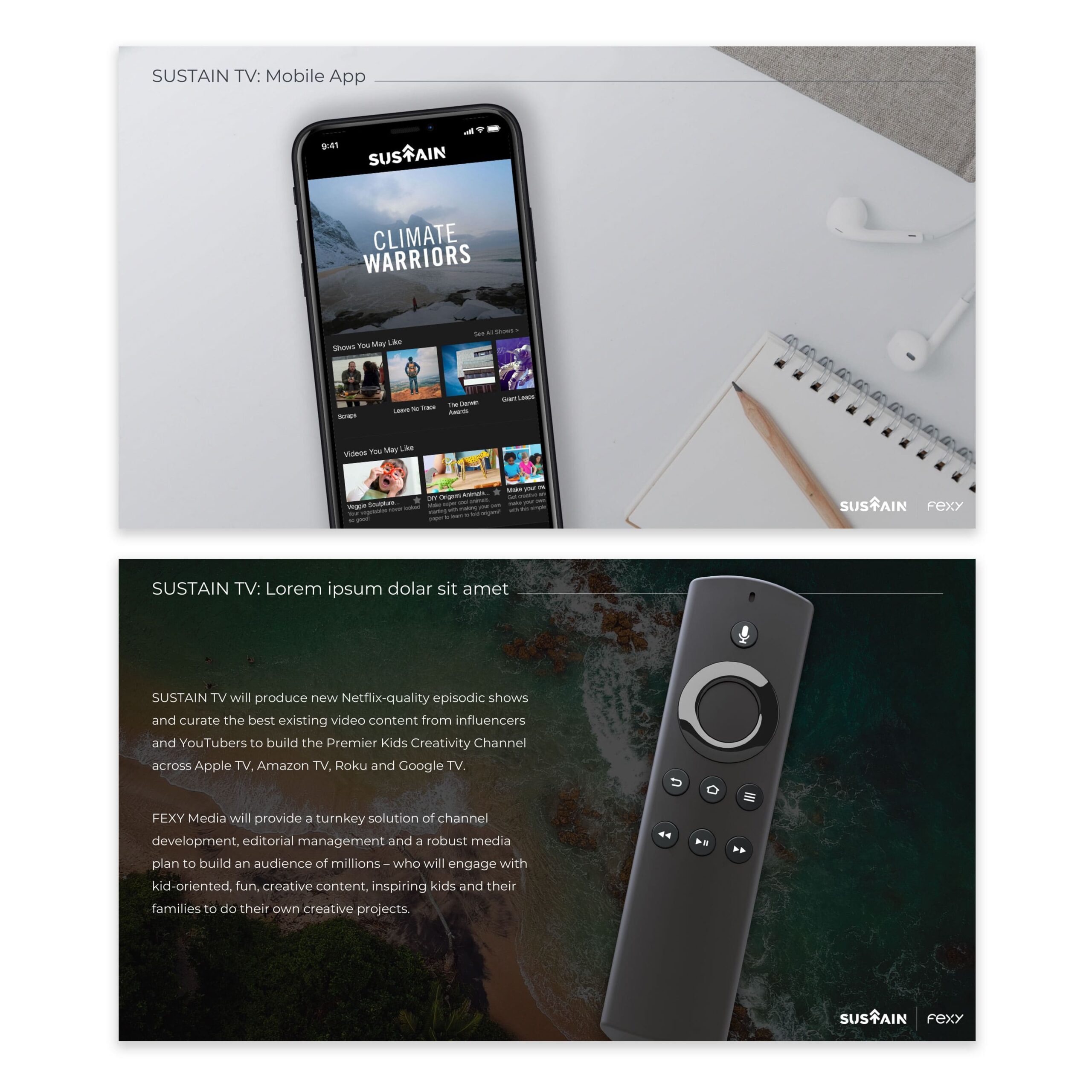 We were invited by our friends at Fexy to develop Sustain’s brand identity and subsequent pitch presentation. Sustain was pitched as a multichannel media network (OTT channel and app) dedicated to promoting sustainable living and igniting change with lasting impact through storytelling. With a continuous stream of high quality series, documentary films, and narrative content, Sustain’s goal was to provide hope and aspiration, joy and celebration, knowledge and empowerment — all to inspire and encourage people from across the world to instinctually prioritize our collective home.